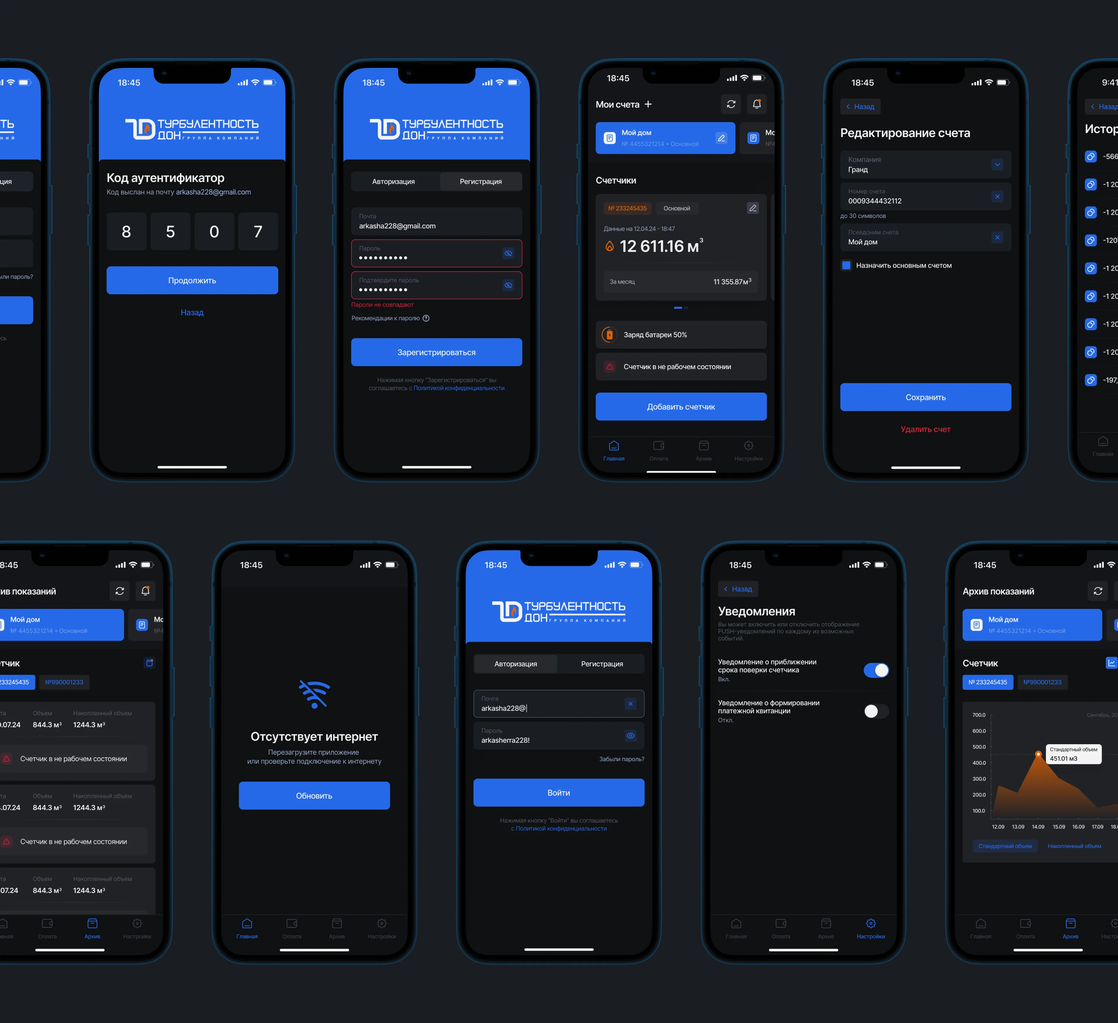 Пользователь проходит простую регистрацию и добавляет данные о поставщике услуг, лицевом счете и установленном оборудовании. Информация сохраняется в системе и используется для автоматического формирования квитанций. Возможно добавление неограниченного количества счетчиков при условии, что все они произведены «Турбулентность Дон».